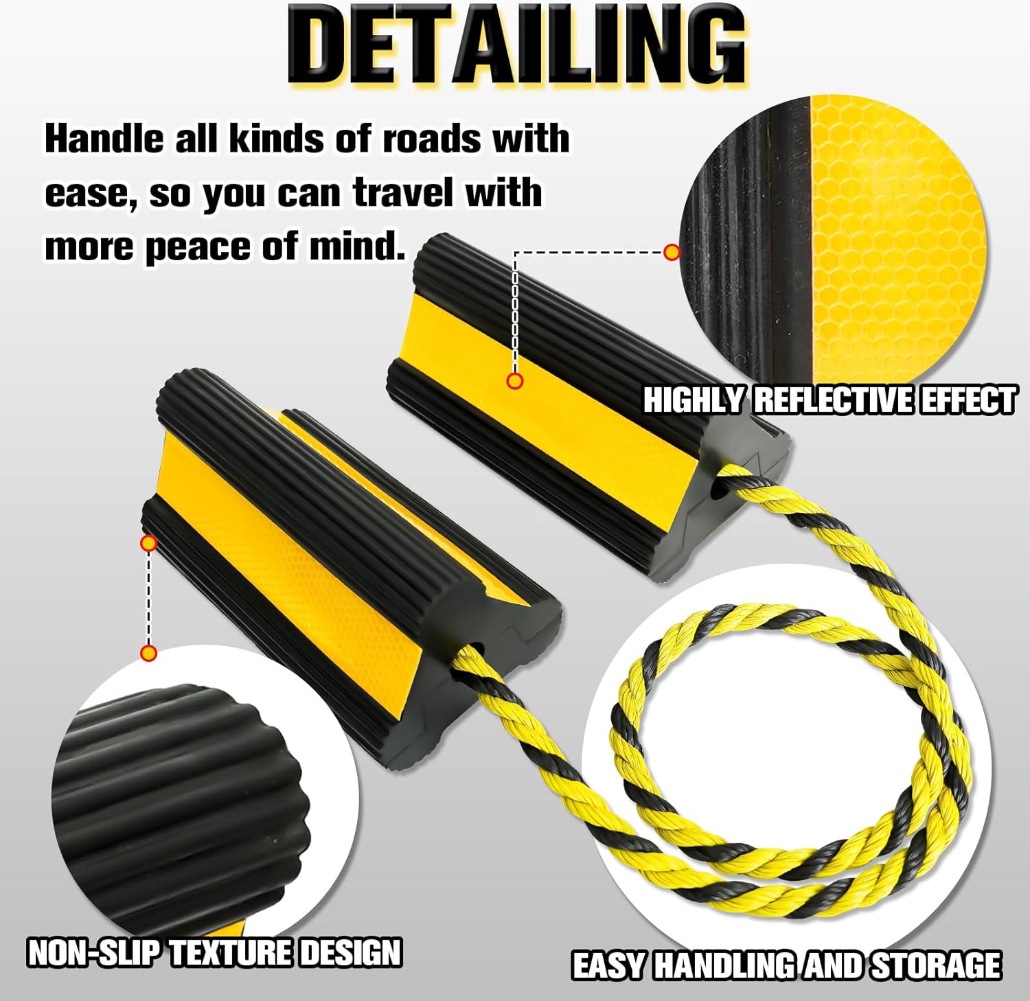 - 4. Easy to Use: With a user-friendly design, our wheel chocks are lightweight and portable, making them convenient to transport and store. Simply place them in front of or behind the tire
