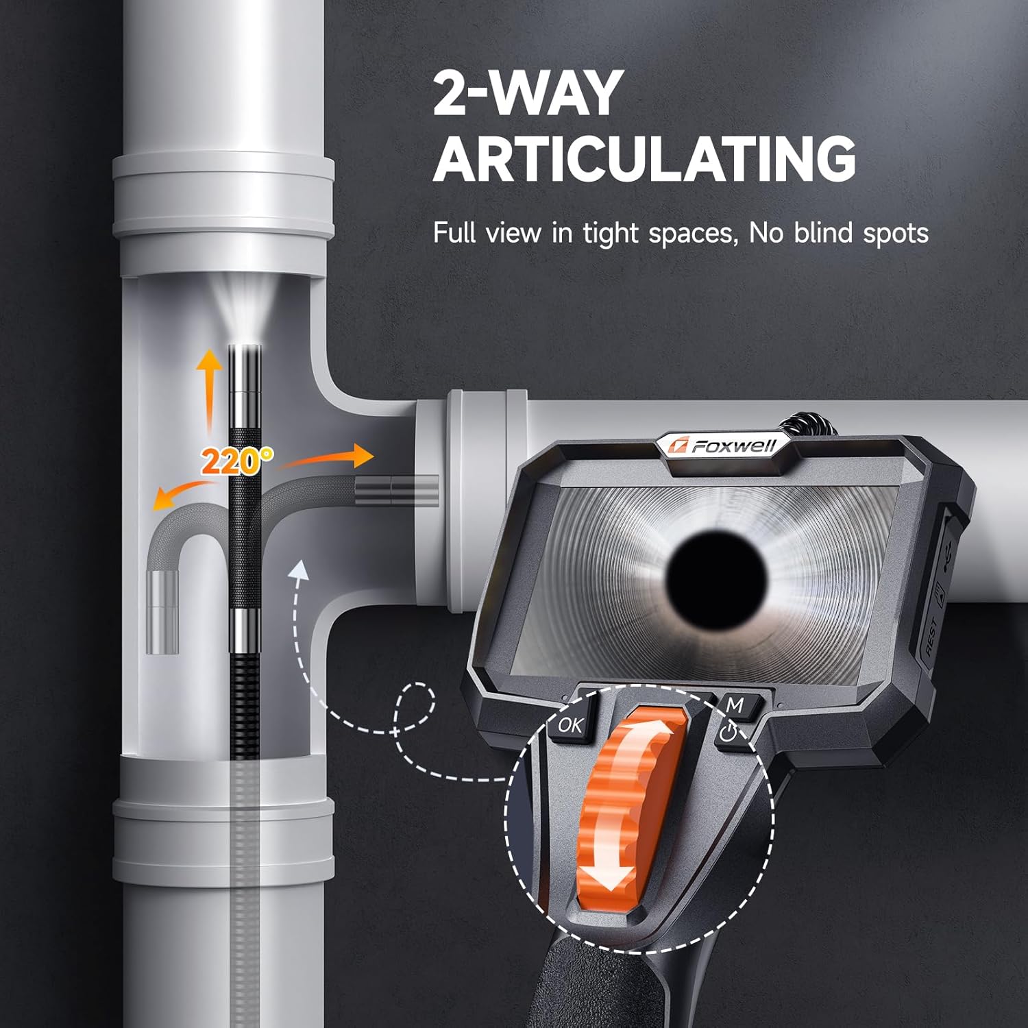 - [Revolutionary 220° Two-Way Articulation for Ultimate Flexibility] Unlike stiff or fixed probes, our camera tip flexes 220° in both directions, letting you easily reach valves, plugs, or hidden damage without twisting the cable. A must-have for thorough inspections in tight spots.