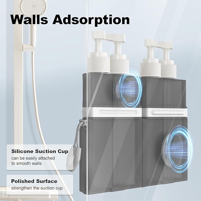 YOTIME 4in1 Travel Bottles Set, Vacuum Silicone Suction Cup for Smooth Walls, TSA Approved Leak Proof Travel Size Containers for Toiletries, Shampoo, Body Wash and Conditioner, Gray