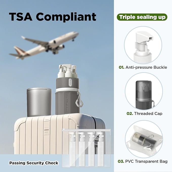 - >Leak Proof Travel Bottles: The dispenser bottle has a built-in anti-squeeze clip to prevent accidental squeeze and leakage; the 4-in-1 integrated design creates a seal when the mouthwash cup is tightened; and the transparent pouch provides extra protection and is TSA compliant.Triple protection allows you to say goodbye to liquid leakage worries, perfect for travel, hassle-free flights and gym trips!