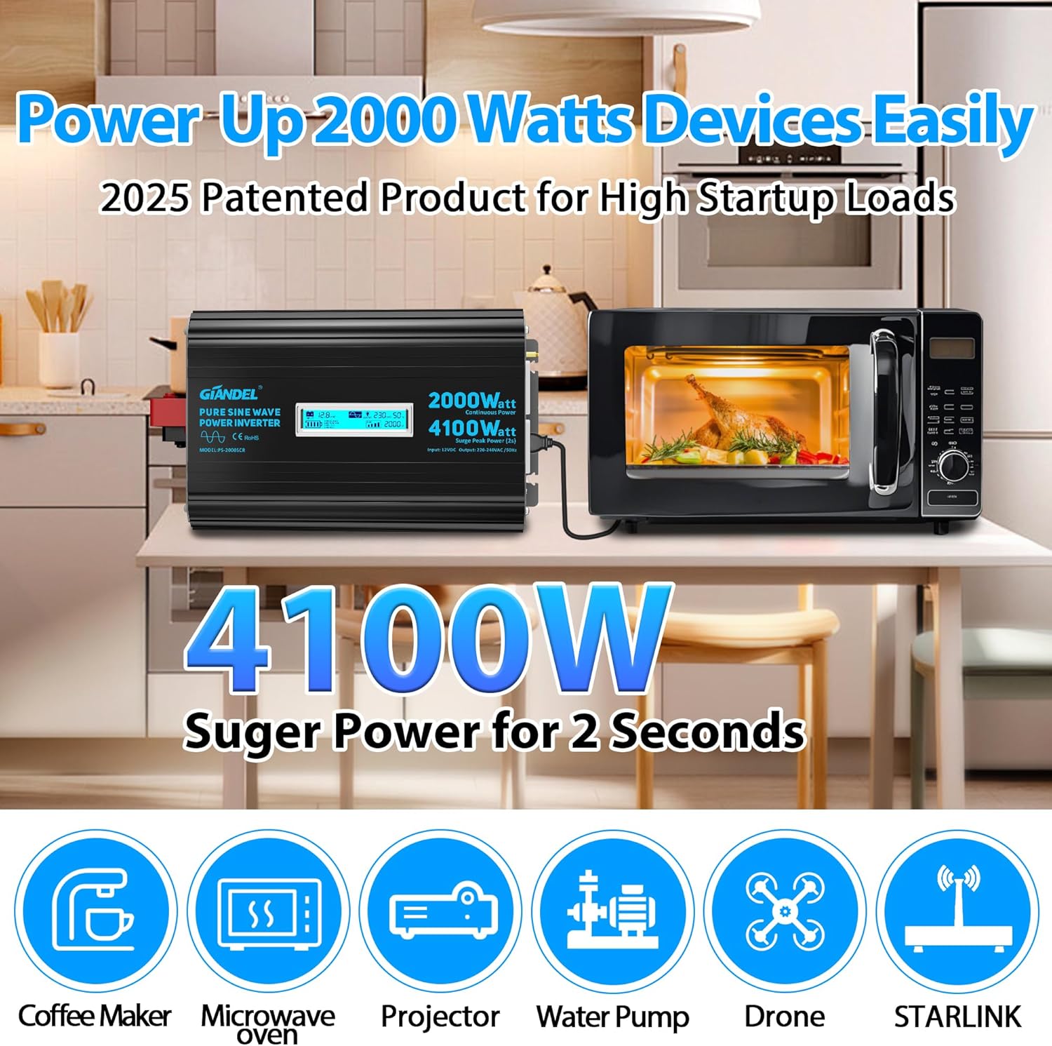 - 【2000Watt Pure Sine Wave Inverter】This 2000 watt inverter pure sine wave version converts 12V DC to AC 110V 120V, ideal to install in RVs, Cars, Vessels and emergency, and computer, hair dryer, 1500Watt microwave and other sensitive equipment not more than 2000watt, Surge Power 4100 Watt for 2 Seconds