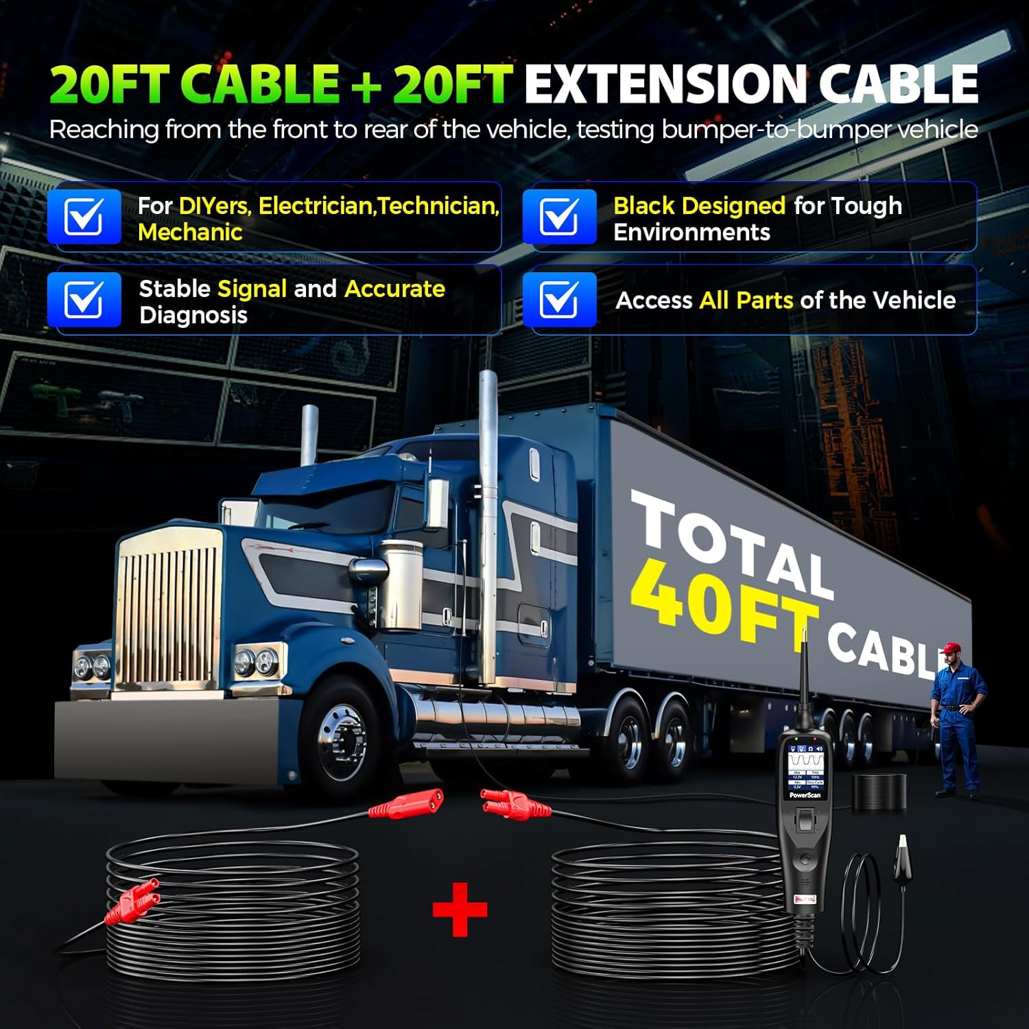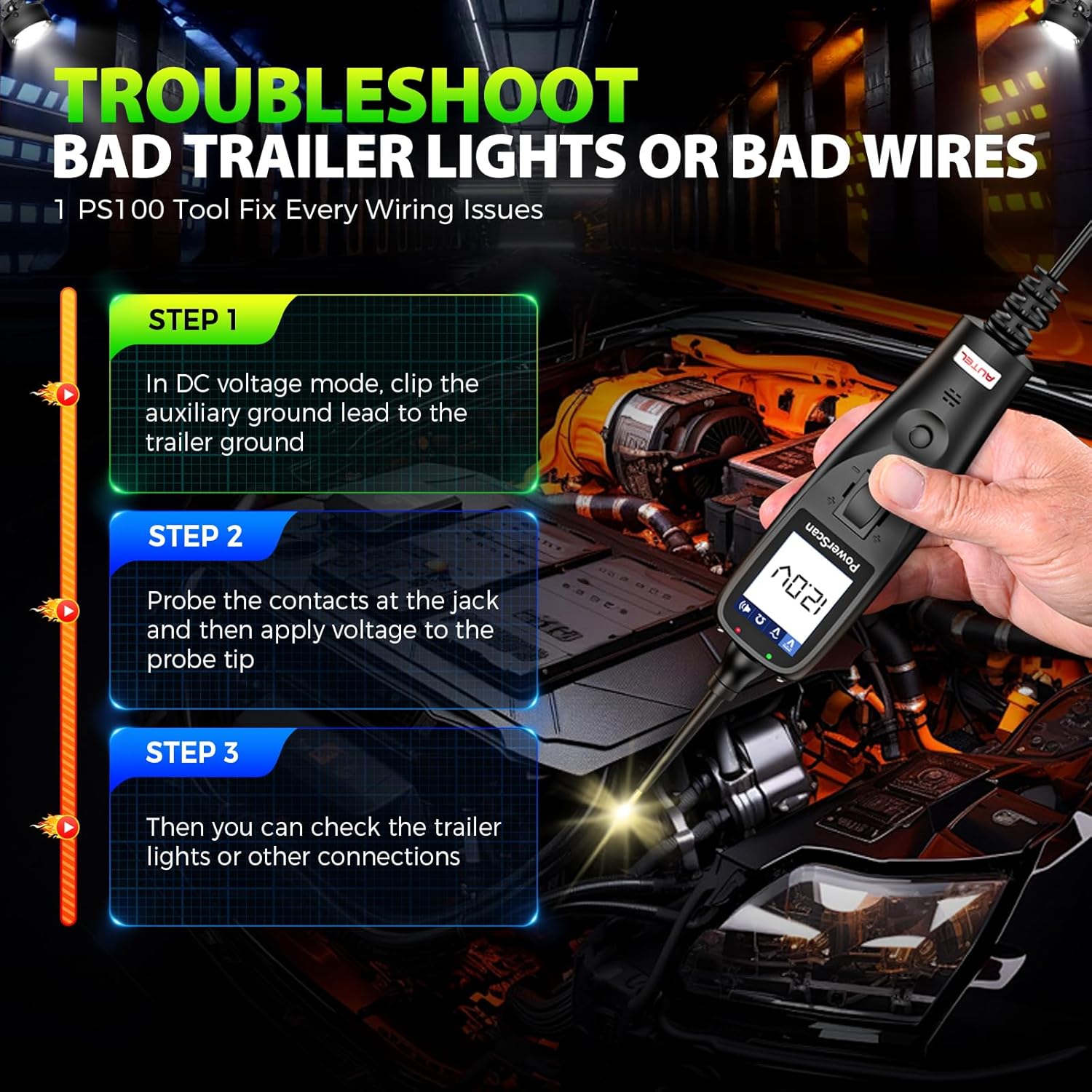 - 🥇【40FT Long Cable, Built-in LED Flashlight, Better Than P.P3/ P.P4】This Autel PS100 Circuit tester automotive has everything the old Pow.er Pro.be 3/4 has, at $100 less in cost. It comes with extra 20ft extension cable, making the reach 40ft, which gives you the freedom to move around the vehicle for testing. Ideal for trailer lines and can be tested along the vehicle. The built-in flashlight allows you to easily troubleshoot even in dim environments.