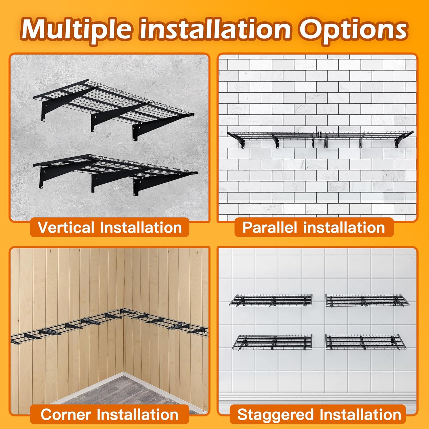 - Easy to install: metal garage wall shelves are designed with a modular assembly design; One person can easily install.Simply place the hole positioning paper, install the bracket, tighten the screws, and the installation is complete; Attention: The garage storage shelves only supports installation on concrete walls and wooden panel walls; Compatible with different joist spacing; Installation can be done with spacing of 16”, 18”, 24”