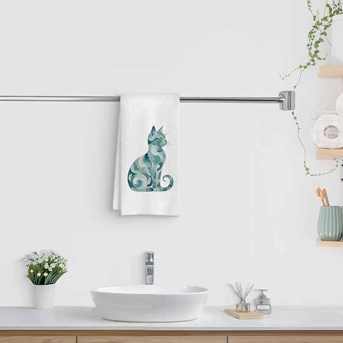 Abstract Blue Swirl Cat Kitchen Towel, Kitten Hand Towel Dish Towel, Pet Gifts for Women Mom Lady Girls, Cat Bathroom Kitchen Decor, 16x24 Inch