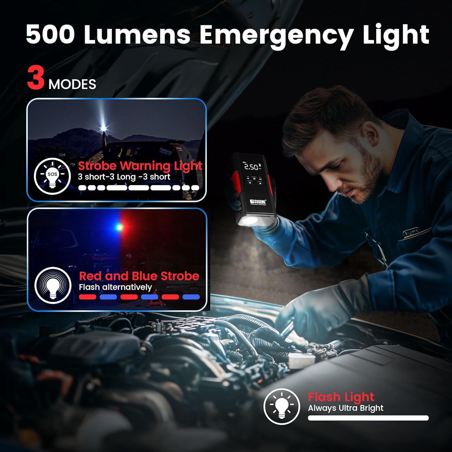 - POWERFUL PORTABLE JUMP STARTER: Reliably jumpstart 12V batteries for cars, trucks, motorcycles, lawnmowers, SUVs, snowmobiles, boats, and more—even in extreme temperatures (-4°F to 140°F). With a high-performance 10,000mAh lithium battery capable of 2000+ charge cycles, the Coseng J26 supports up to 6.0L diesel and all gasoline engines, ensuring dependable power for every emergency.