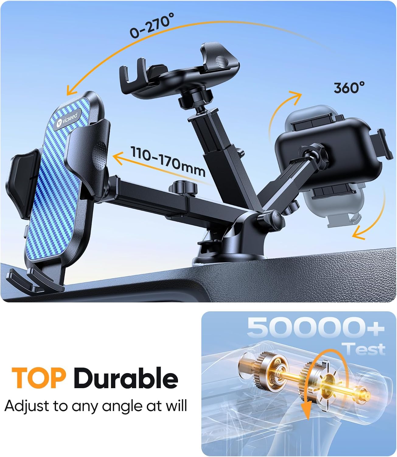 - [360° Adjustable – Perfect View, Zero Wobbling] With a 360° rotating head & 270° telescopic arm, position your phone vertically or horizontally for GPS, calls, or music. This phone mount for car stays rock-solid, even on bumpy roads. No more distractions—just safe, hands-free driving.