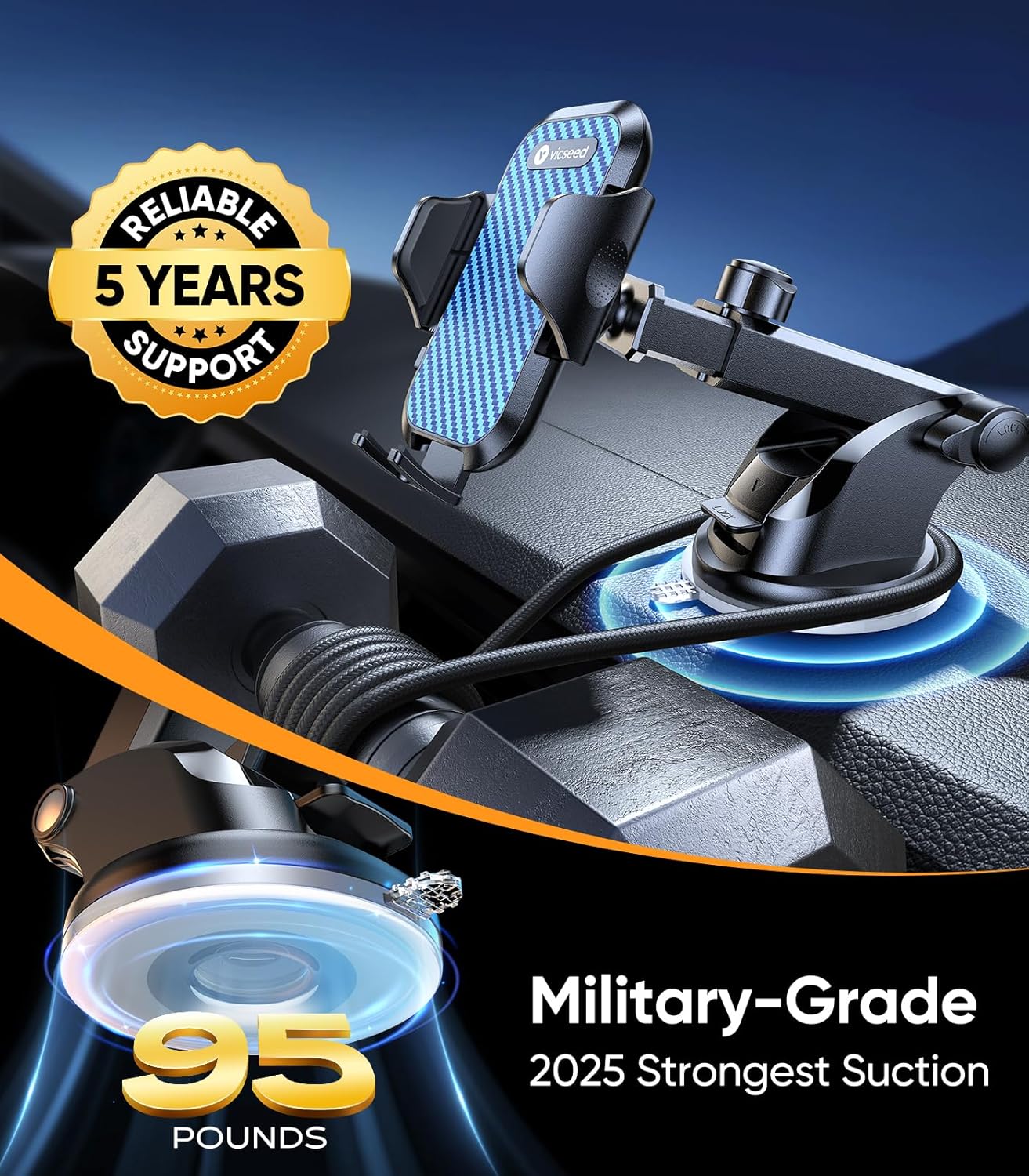 - [Super Strong Suction – No Falling, No Marks] 2025 upgraded car phone mount features a military-grade suction cup that holds 95+ lbs on your dashboard, windshield, or air vent. Unlike cheap mounts that melt or leave sticky residue, it leaves no residue and resists heat from -40°F to 194°F. Perfect for SUVs, trucks, taxis, and all cars, making it the most secure phone mount for car.