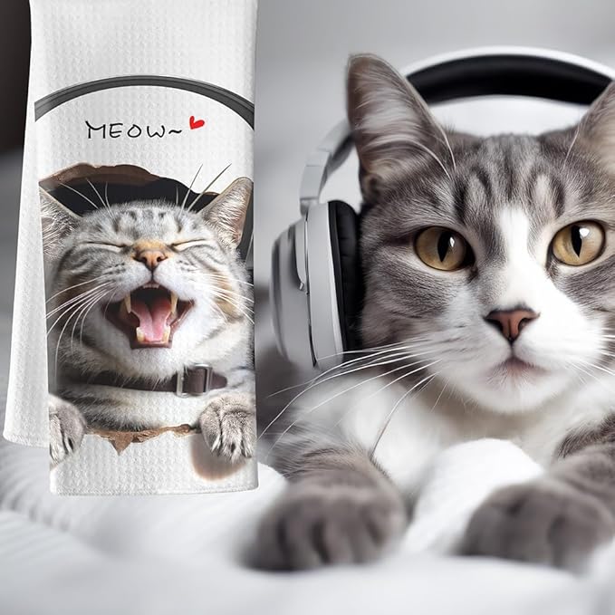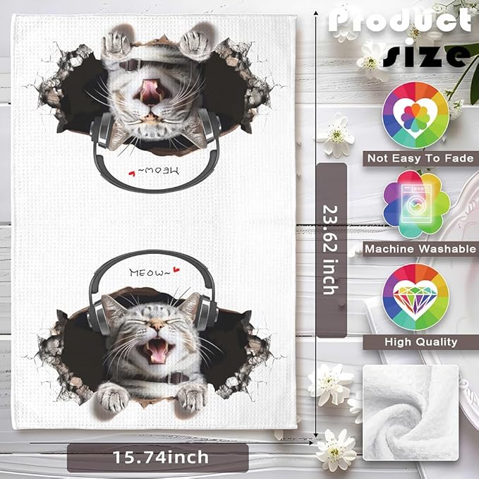 - 【Best Decoration】This is a playful pattern design-Two cute kittens stick their heads out of the hole in the wall. cute kitten wearing glasses is saying hello to you "Meow-Hello, beautiful" to you, and the other one listens to music with headphones, as if enjoying the music at the moment.-Interesting towels or hand towels add a relaxing and pleasant atmosphere to you,Add a touch of fun to your family