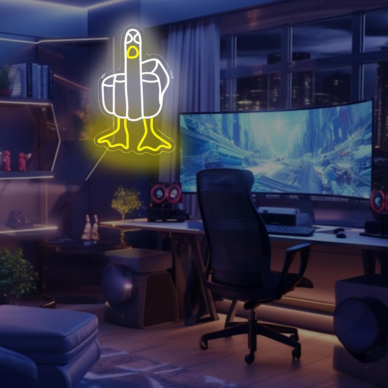 - Creative & Playful Duck Neon Sign – This unique cartoon-inspired neon sign combines hand gesture elements with duck features, outlined in crisp white neon with bright yellow duck feet. The contrasting colors make it a bold and eye-catching decor piece.