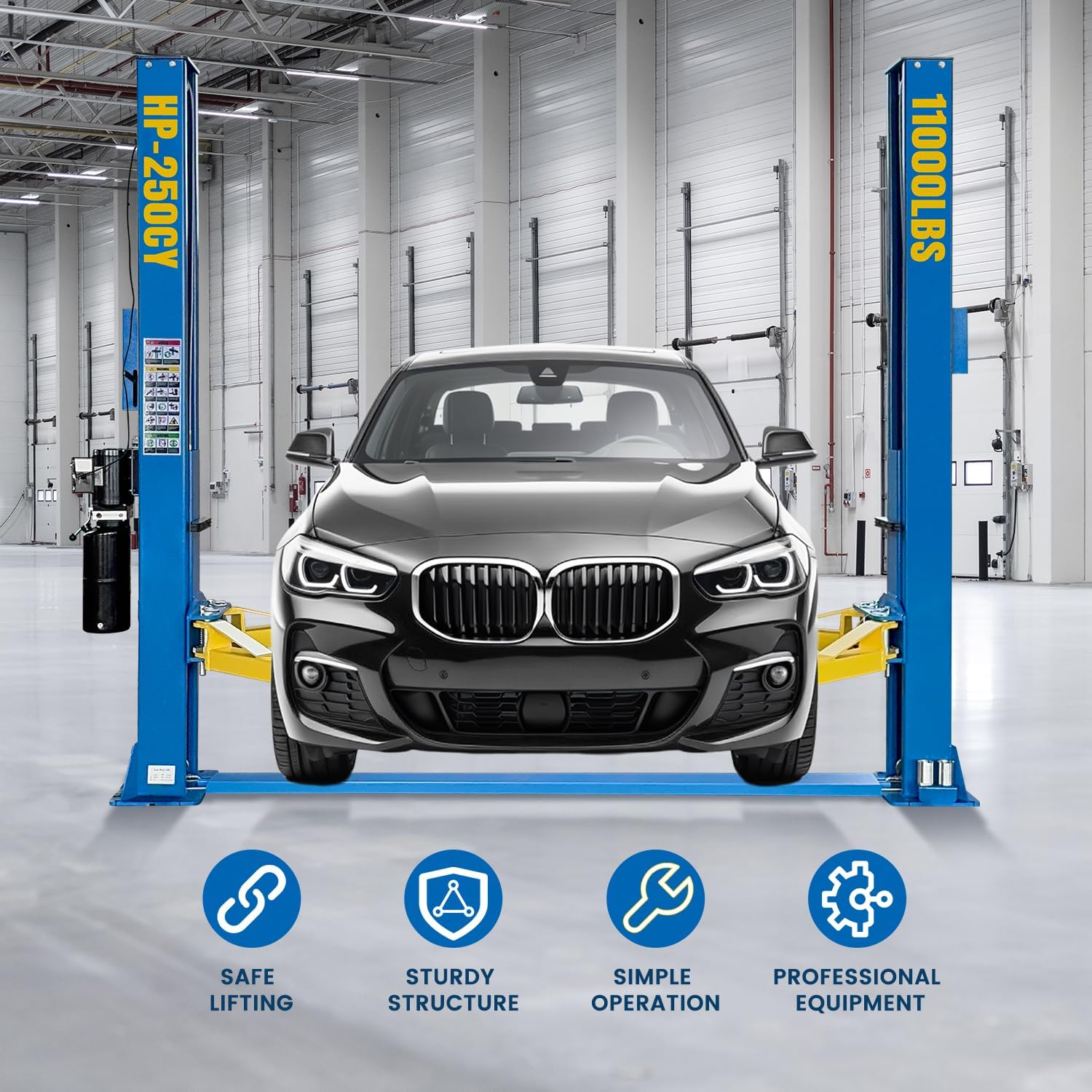 - Top hydraulic system, 110 V ; 11,000 lbs Capacity, Driven by dual hydraulic cylinders. Auto Car Lift is CE certified.Standardized for 115% dynamic load capacity and tested for 150% static load capacity