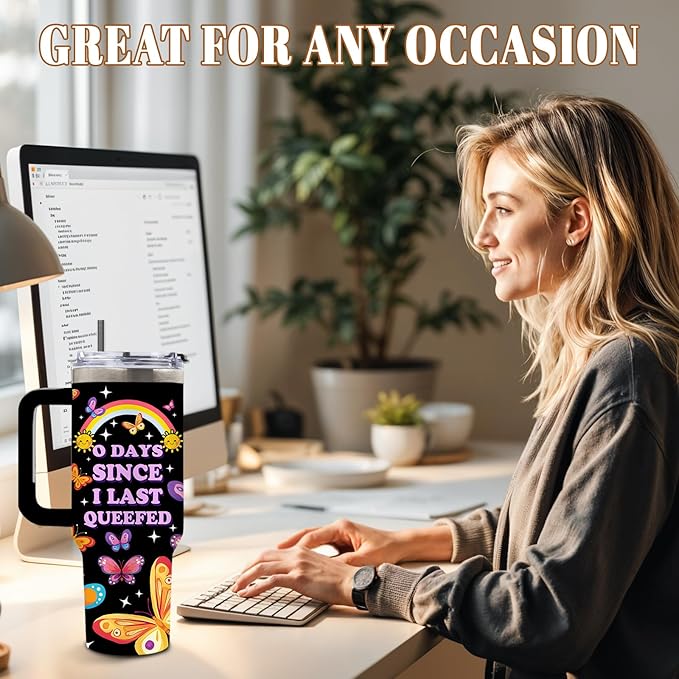 - Versatile and easy to clean, this funny butterfly tumbler is ideal for daily use. Made from good-quality stainless steel, it resists stains and odors, making it a long-lasting addition to any drinkware collection while keeping the laughter going