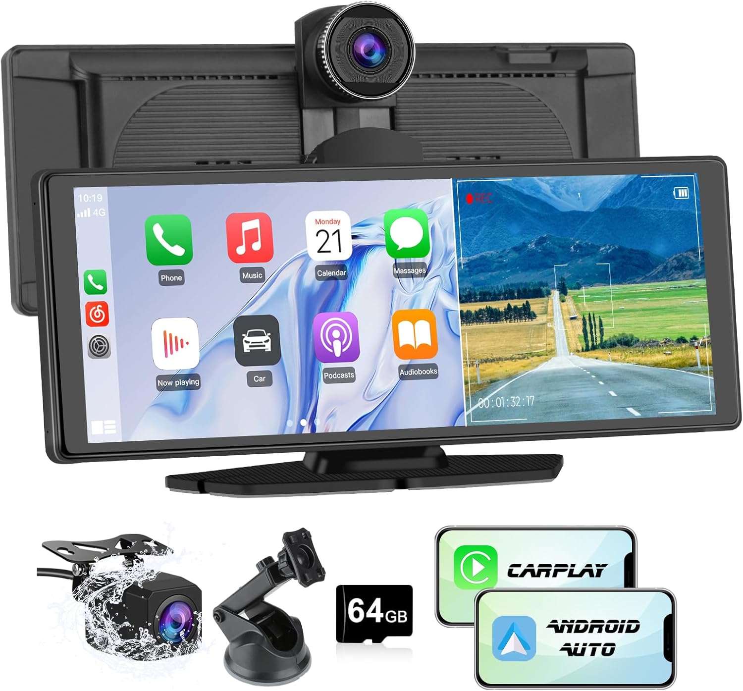 Portable Wireless CarPlay Screen for Car with 4K Dash Cam and 1080P Backup Camera, Car Stereo with 10.26”IPS Touch Screen, Support Carplay/Android Auto/GPS/Bluetooth/Mirror Link/AirPlay