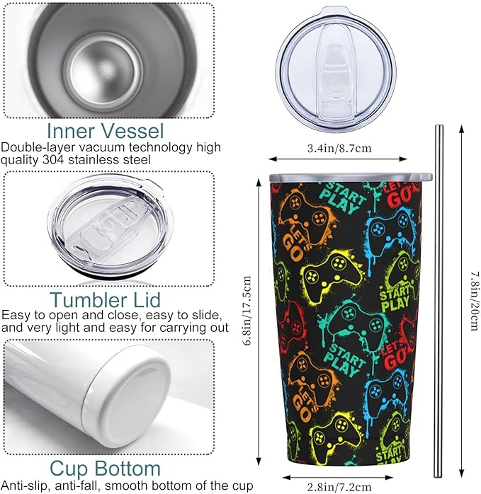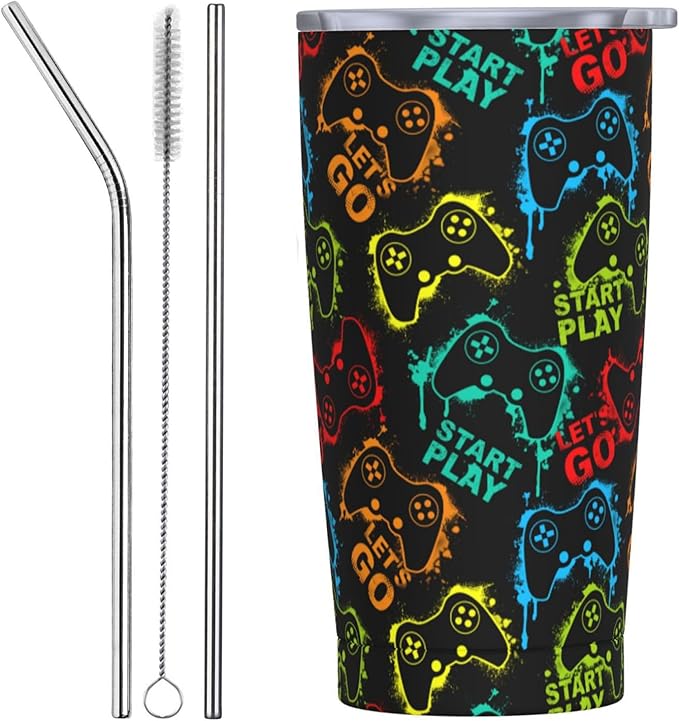 Yobvec Gaming Tumbler Cup with Lid and Straw, 20 Oz Stainless Steel Insulated Gamer Mug Gaming Accessories