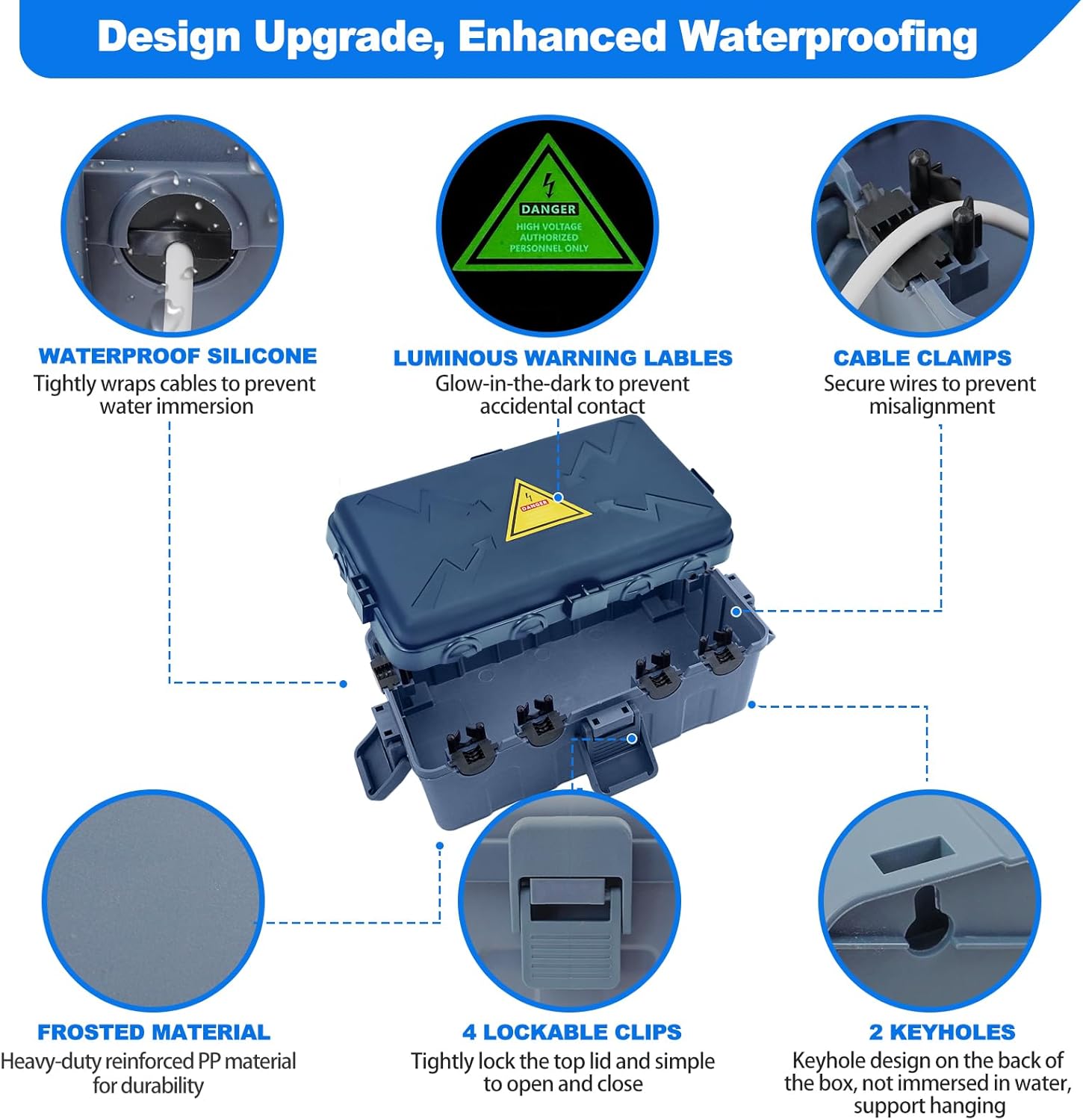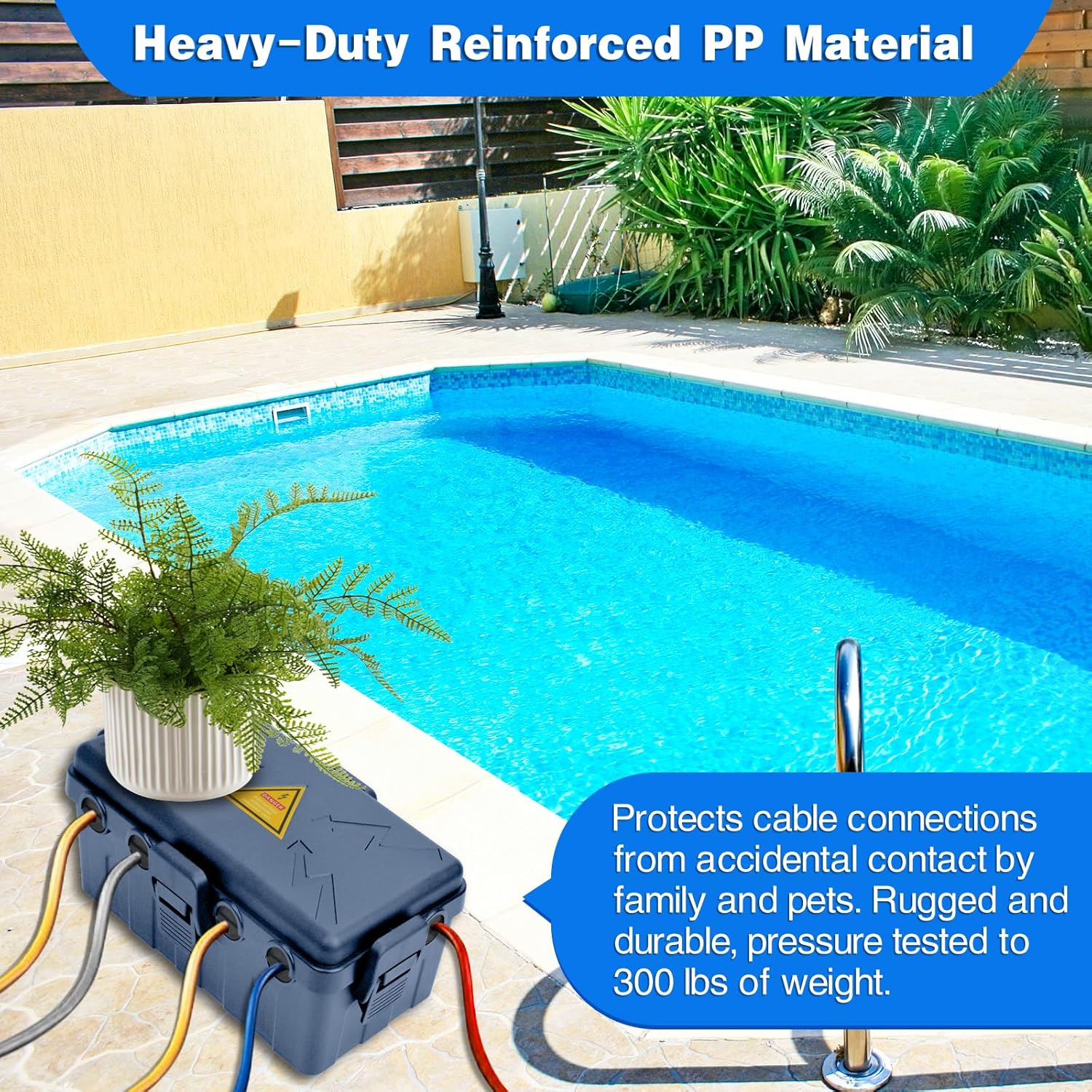 - LUMINOUS SAFETY WARNING LABEL: the lid of the outdoor electrical box has a luminous warning label that glows at night to prevent accidentally touching it, ensuring the safety of your family and pets.