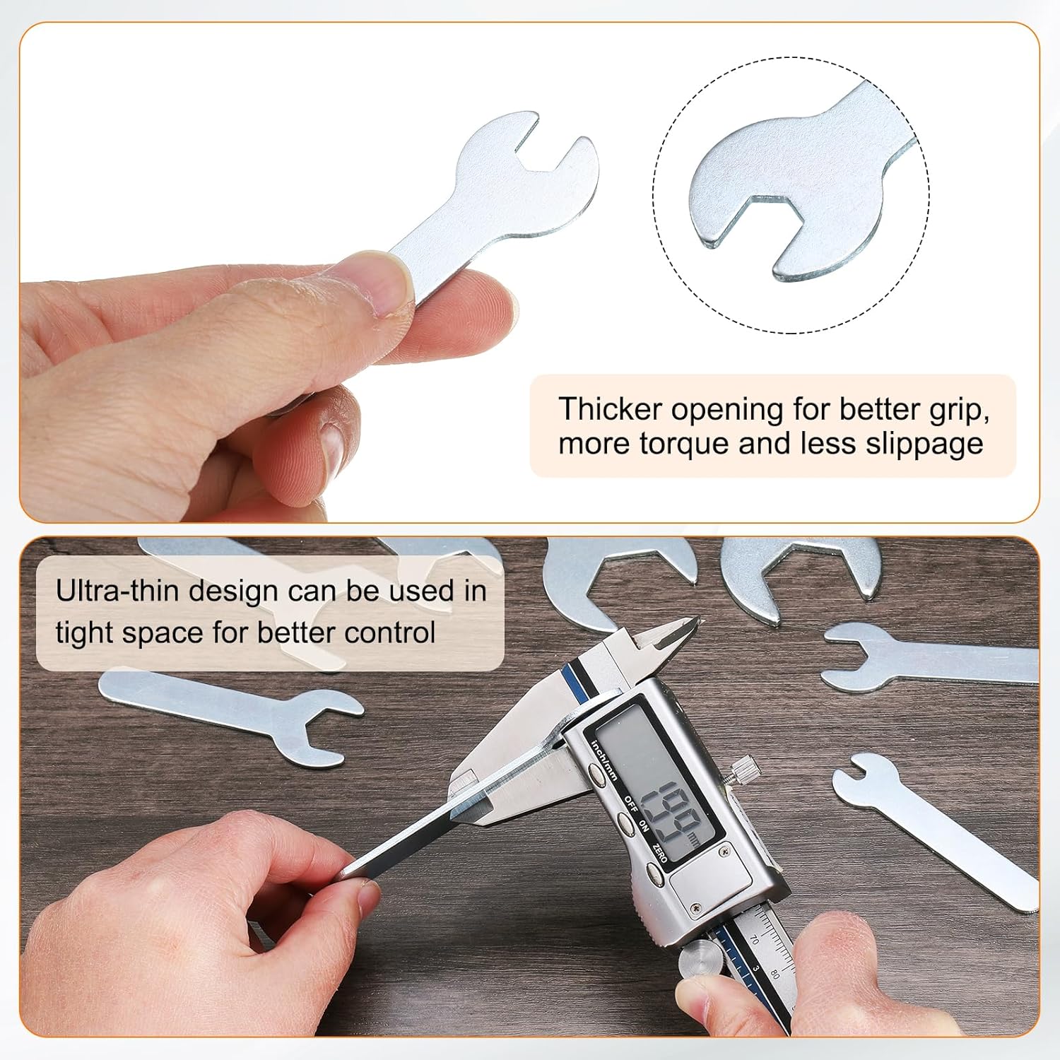 - Standard Size - The standard open-end wrench's increased thickness ensures a more secure grip on nuts and bolts, resulting in better torque transfer and less slippage. The precision socket allows for quick and easy adjustment of the wrench size to accommodate different bolt sizes. The ultra-thin handle is comfortable to hold and improves work efficiency.