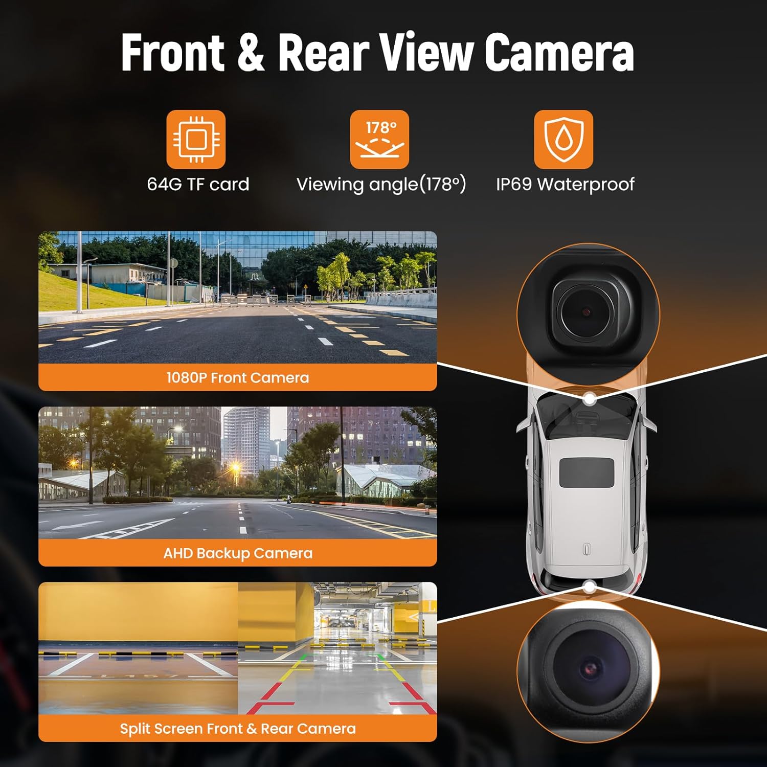 - 【Dual Camera, Front & Rear Recording】Equipped with a waterproof 2.5K HD front camera, an AHD rear camera, and 178° full-viewing angle. The front and rear views can be displayed in split screens, making it safer and more efficient when reversing. 64GB TF card, the system automatically enters loop recording mode after inserting the card. No more worries about memory issues