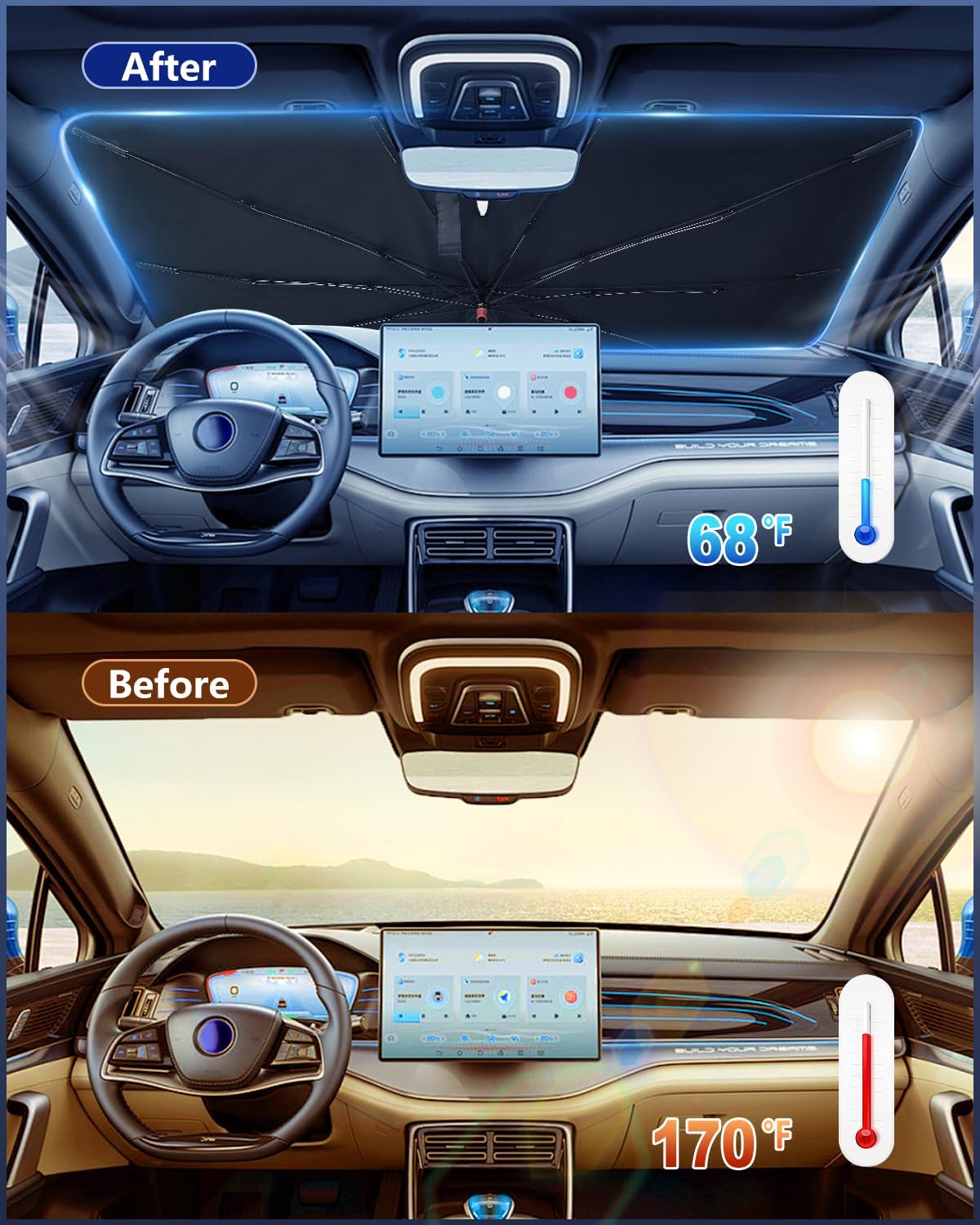 - 【Available in Multiple Sizes】 Choose from three sizes — S (58" L x 31" W), M (61" L x 33" W), and L (63" L x 35" W). Perfectly fits cars, SUVs, and trucks. Measure your windshield before ordering to ensure the best fit for optimal sun protection.
