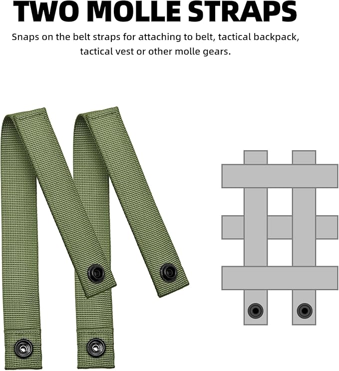 • Multiple Carrying Option:The tactical water bottle holder is equipped with two MOLLE back straps featuring metal snaps, allowing it to be securely attached to MOLLE-compatible gear such as backpacks or battle belts. It also includes a sturdy hook, ideal for holding keys or other small tools