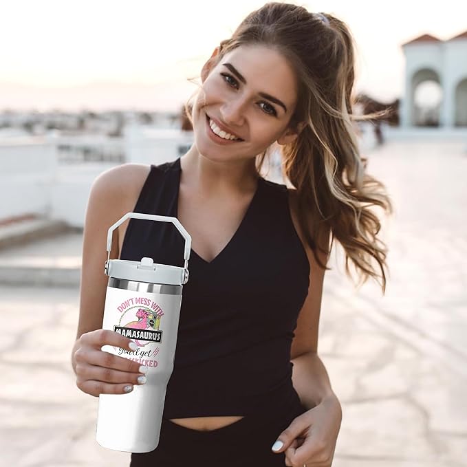 - Mommasaurus Tumbler Sturdy And Durable: this 30 ounce tumbler is made of high-quality stainless steel, it has excellent resistance to drop, pressure and corrosion. The straw and lid of the mommasaurus cup are made of safe, high-quality plastic and silicone. 30 ounce tumbler with handle and straw can accompany you through a long time.