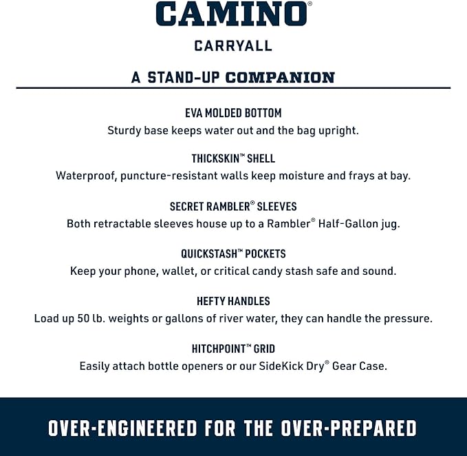 - MULTI-FUNCTIONAL - The waterproof, puncture-proof, Camino Carryall is designed for whatever the day throws your way. Perfect tote bag for the boat, lake, pool, beach, camping or road trips. Easy to haul your gear and easy to clean, the Camino Carryall is the last word in uncompromising convenience