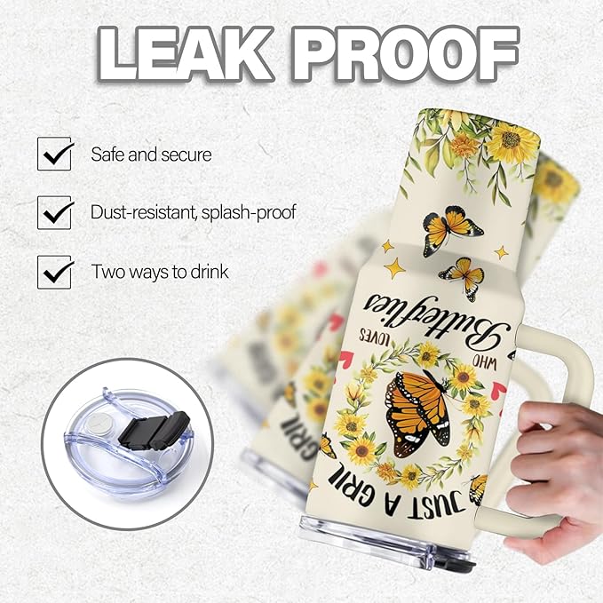 Butterfly Gift, 40 Oz Just a Girl Who Loves Butterflies Tumbler with Handle & Straw, Birthday Gifts for Animal Lovers Women Men, Stainless Steel Yellow Butterfly Tumbler
