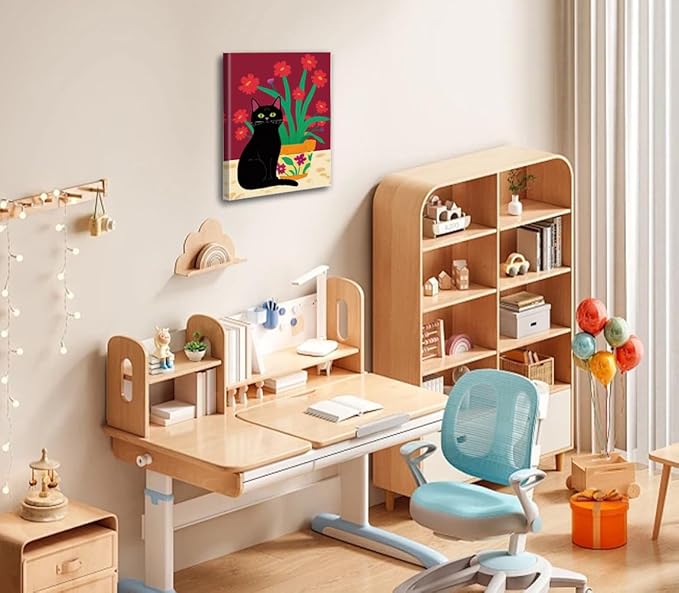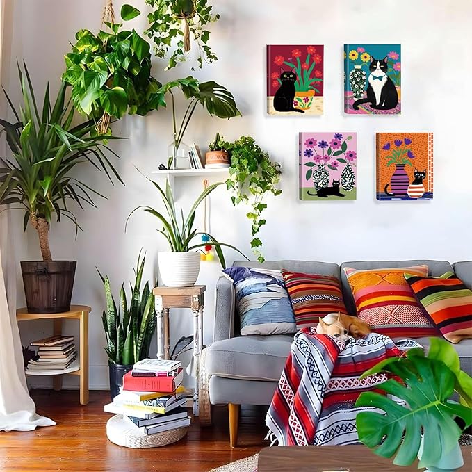- DESIGN COLLECTION: Set of 4 whimsical black cat canvas prints featuring vibrant floral backgrounds and decorative vases in various artistic styles