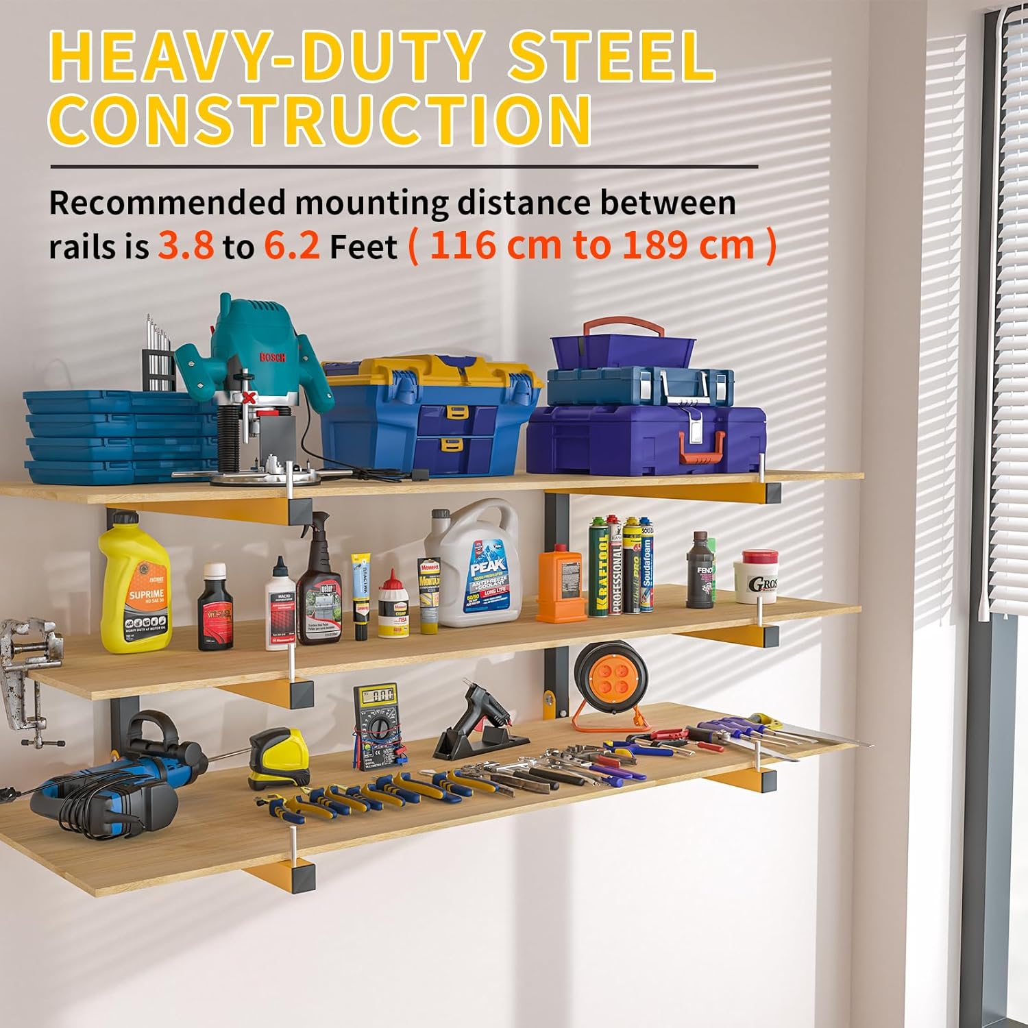 - 3-LAYER WALL-MOUNTED WOOD RACK: Heavy Duty Wood Storage Shelves for organizing the garage is welded with industrial precision and equipped with drywall anchors and high-strength screw kits. The wooden storage rack orange arm is 16 inches long. Suitable for various walls, such as concrete walls, wooden walls, red brick walls, etc.
