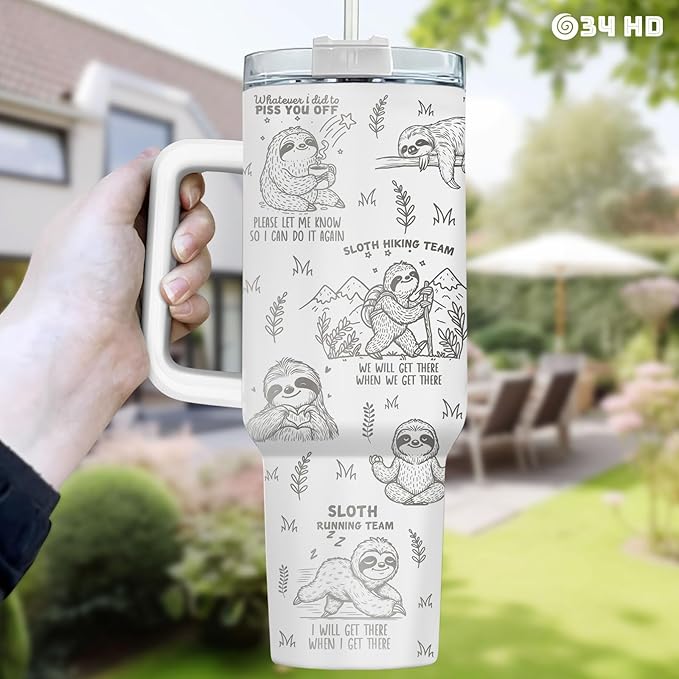 34HD Laser Engraved Sloth Tumbler with Handle and Straw, 40oz Stainless Steel Insulated Travel Coffee Mug, Sloth Gifts for Women, Sloths Lover Gifts