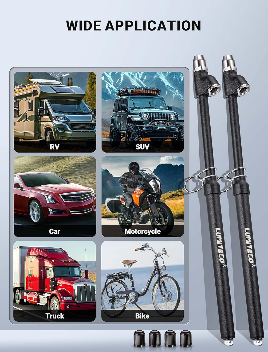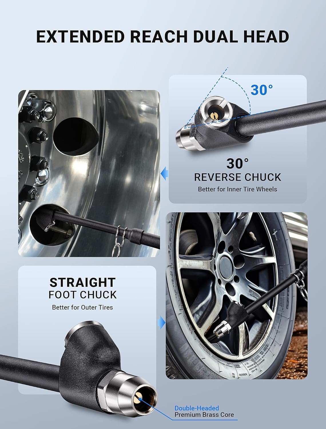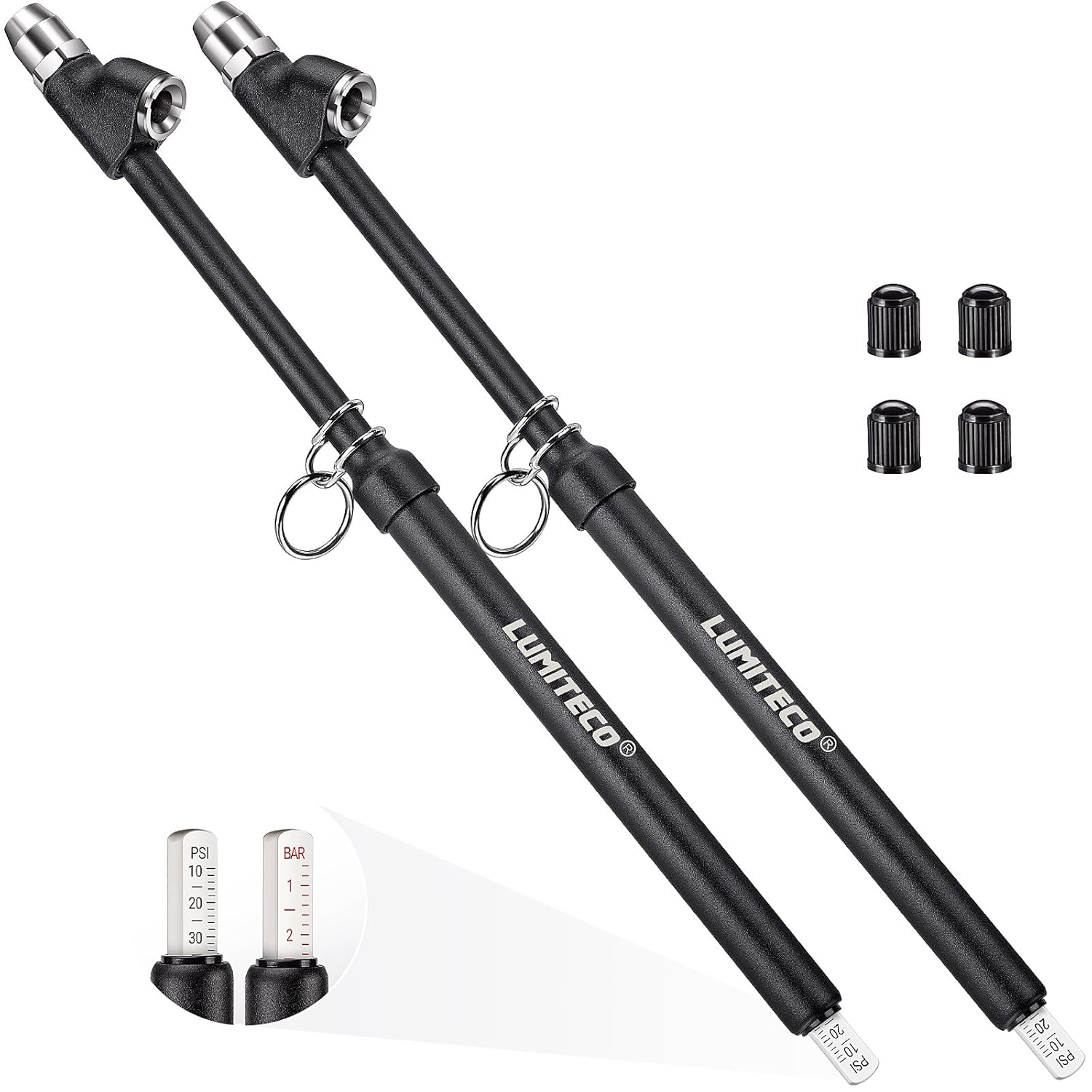 - 【EXTENDED REACH DUAL HEAD】LUMITECO 12" pencil-style pressure gauge is designed with an integrated straight foot air chuck and 30° reverse chuck. Perfect for dual wheels and other hard-to-reach valves. Also comes with 4 extra valve stem caps for replacement, your great choice for checking tire pressure and a fantastic Father's Day gift.