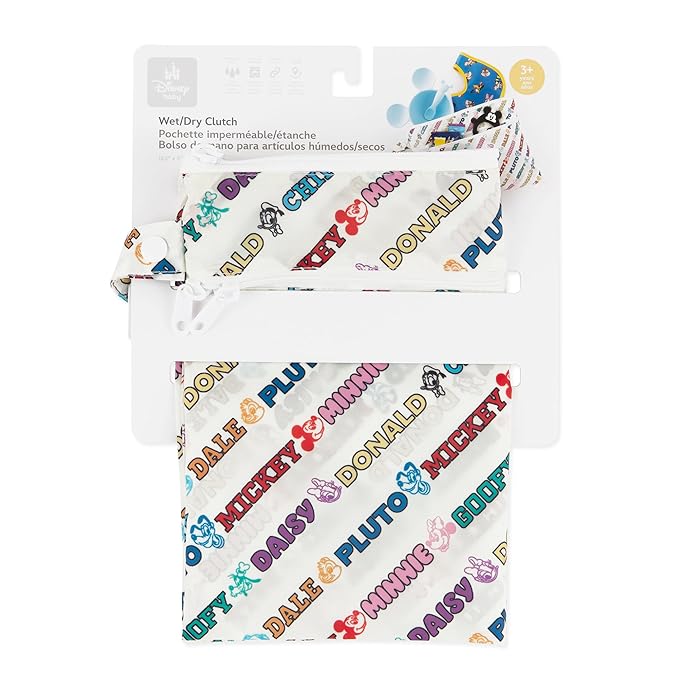 Bumkins Disney Waterproof Wet Dry Clutch Bag for Baby, Travel, Swim Suit, Diapers, Pump Parts, Pool, Gym Clothes, Toiletry, Hook to Stroller, Daycare, Packing Pouch, Zip Bag, Mickey and Friends White
