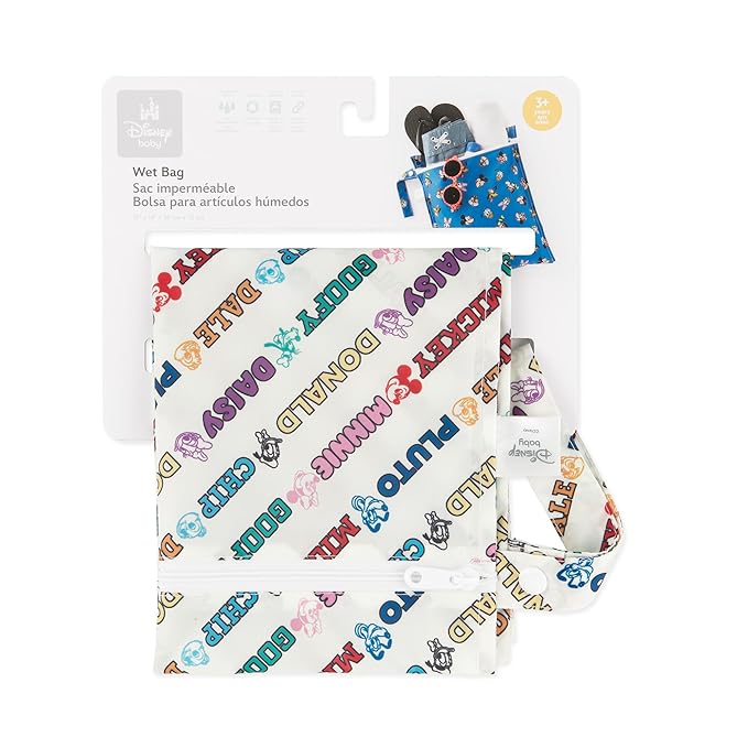 Bumkins Disney Waterproof Wet Bag for Baby, Travel, Swim Suit, Cloth Diaper, Pump Parts, Pool, Beach, Gym Clothes, Toiletry, Hook to Stroller, Daycare, Zipper Reusable Wetdry, Mickey and Friends White