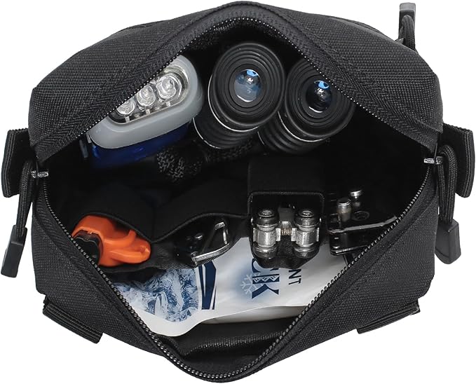 - TOUGH QUALITY: Admin molle pouch size: 6.7" x 4.3" x 1.9". Made of tough, durable and lightweight 600D nylon. Sturdy double zippers for the top to the sides quickly ,easily see what you have. The sturdy Molle system and copper snap button make it more firmly attached to other tactical gears