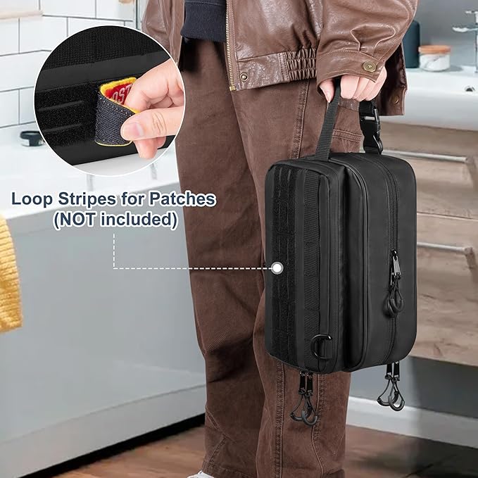 - DURABLE & FUNCTIONAL: Crafted from splash-proof material, this bath bag helps protect your essentials from shower steam or light rain, Ideal for travel and outdoor enthusiasts. The military-style design is both rugged and practical, with an outer MOLLE system for additional storage.