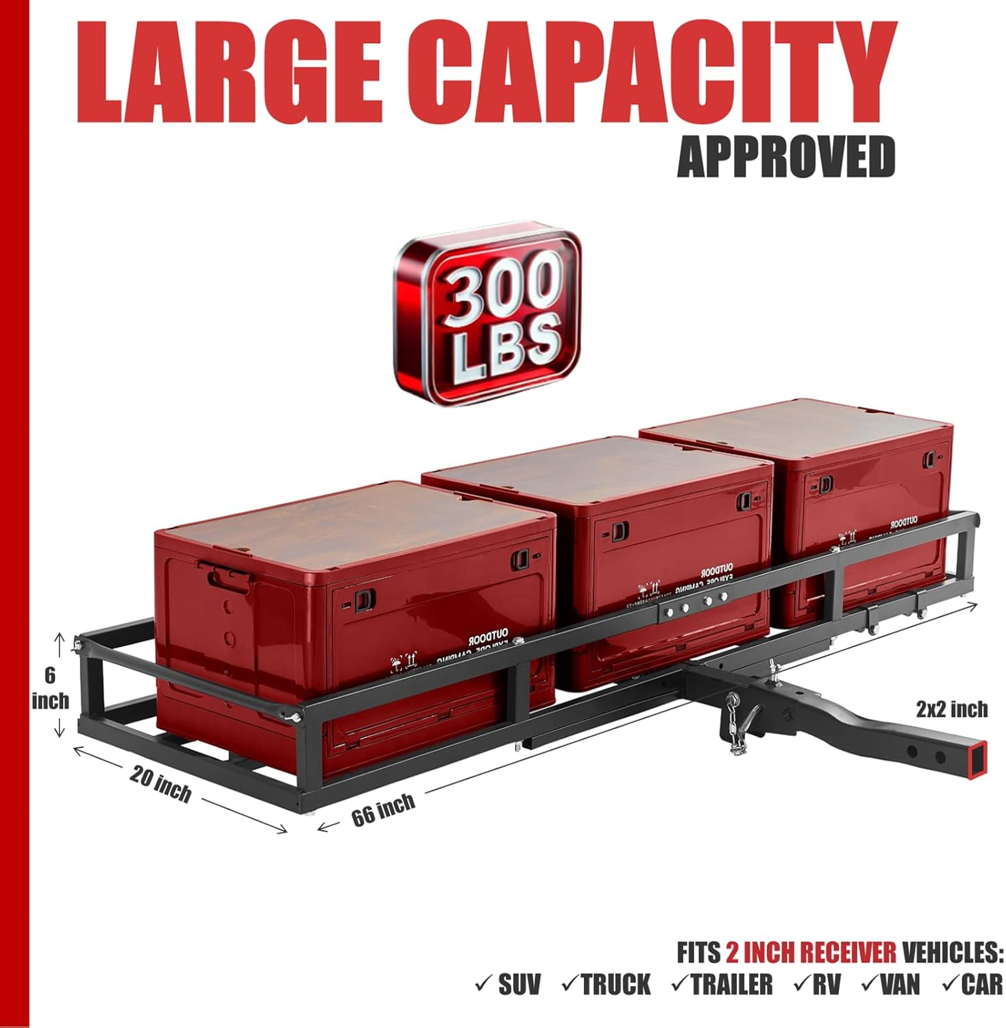 - LARGE HITCH CARGO CARRIER: Ideal for travel trailers and outdoor adventures, as a hitch rack, it boosts your vehicle's storage capacity during travel. As a hitch cargo rack, it measures 66x20x6 inches, offering ample space and strong load-bearing capability to haul camping gear, travling items and more up to 300 lbs.