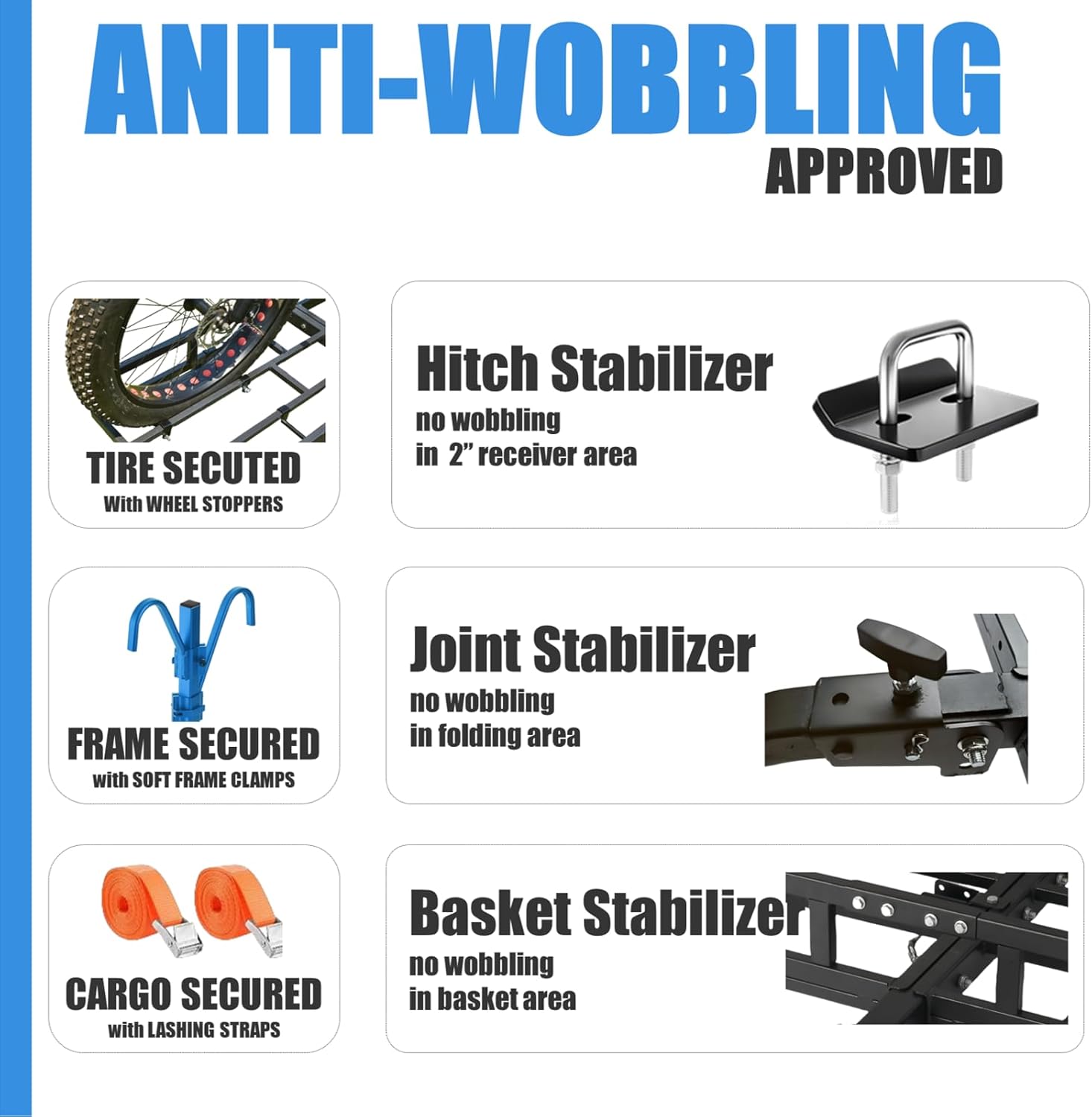 - STURDILY BUILT & EASY USE: Treated to resist rust and corrosion, this hitch cargo bike rack withstands tough weather conditions. The foldable design saves space and makes parking easy when not in use