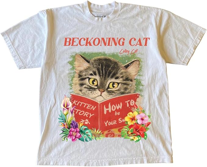 - Product Design: Showcasing a bold stamp-style kitten graphic with vibrant colors and text details The relaxed fit and round neckline add a laid-back, stylish vibe