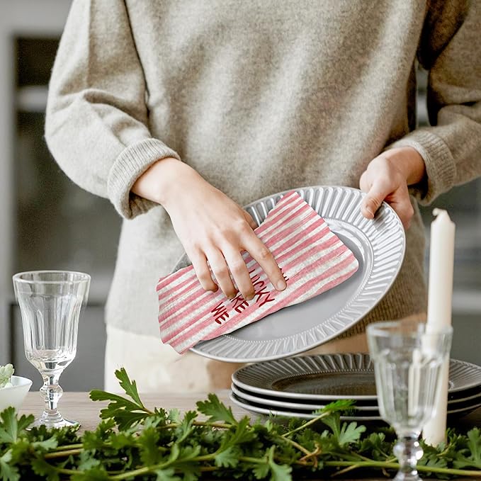 Trendy Pink Red Striped Kitchen Towels, How Lucky are We Decorative Hand Towels, Pink Girly Dish Tea Towels for Kitchen Decor, Trendy Preppy Bathroom Decor, 16x24 Inch