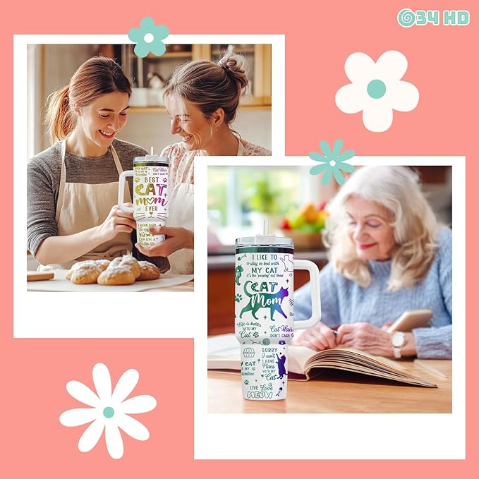 34HD Funny Engraved Cat Mom Tumbler with Handle and Straw 40oz, Paw Mom Cup Insulation, Birthday Mothers Day Gifts for Cat Lovers Women Auntie Friends