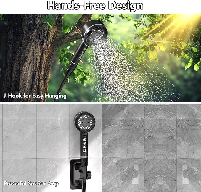 - 【Massage Shower Design】The unique massage shower head provides a variety of spray modes, including strong spray, delicate spray, etc., which can adjust the spray intensity and water flow mode to experience a comfortable spa effect. The additional hook allows you to hang it securely on a tree branch or tent rack. The included suction cup can fix the shower head on any smooth surface.