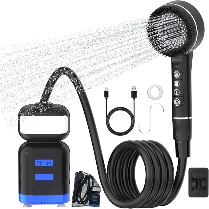 - 【Rechargeable High Capacity Battery】Our travel shower pump has an 8000 mAh battery that can run continuously for 150-240 minutes. Ensure long-term use for activities such as camping, traveling, and beaches without frequent charging. The Type C interface provides multiple charging options and can be connected to a power bank, laptop, or car USB for charging, which is perfect for outdoor adventures. The port is equipped with a silicone waterproof cover for safe use.