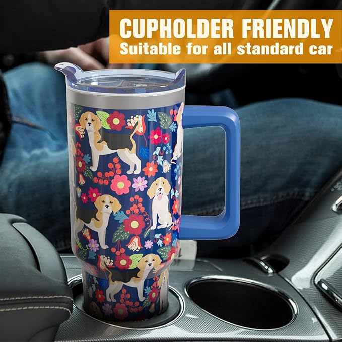 Beagle Gifts for Women Dog Lovers 40 oz Floral Beagle Tumblers with Handle and Straw, Stainless Steel Vacuum Insulated Travel Coffee Mug Cup Water Bottle