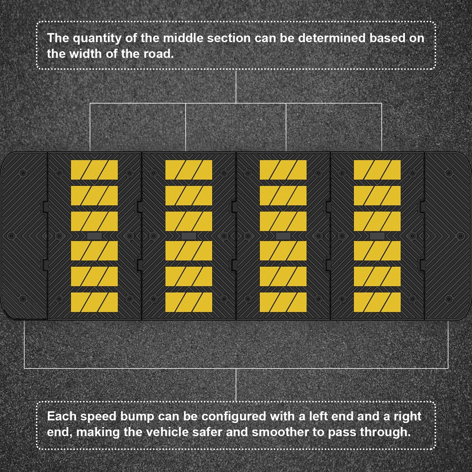 - Left and Right Ends --- 35" x 10" x 2" inch, a set of left and right ends, make the entire speed bump have slopes in all 4 directions, which can withstand the impact force of vehicles traveling from any direction, further ensure safety.