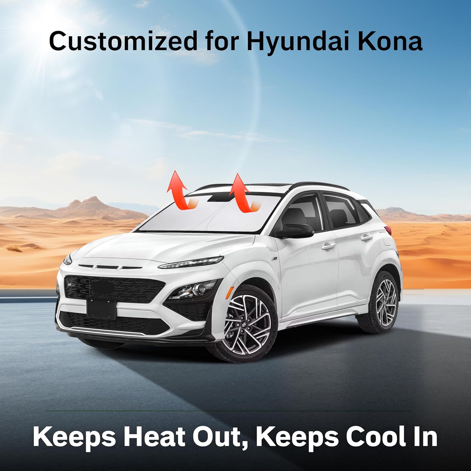 - Custom Fit for Hyundai Kona (2018–2025) – Precisely designed to fit all Hyundai Kona models from 2018 to 2025—including SE, SEL, N Line, Limited, and Electric (EV) trims. This front windshield sunshade conforms snugly to your Kona’s glass, delivering edge-to-edge coverage with zero gaps or sagging. The perfect sun protection for compact SUV drivers.