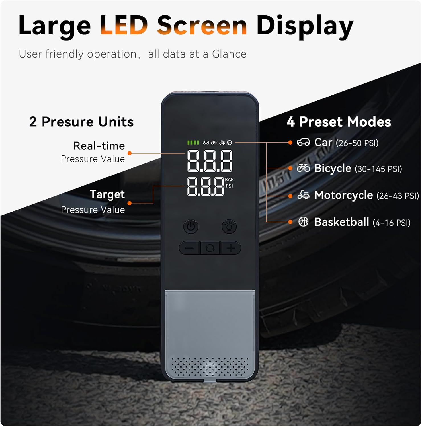 - 【LED digital display】 Equipped with an LED digital display, it can easily read preset and real-time pressures (with ±1 PSI accuracy). It also includes 5 preset modes - Bike, Motorcycle, Car, Ball and Custom - that automatically stop when a preset value is reached.