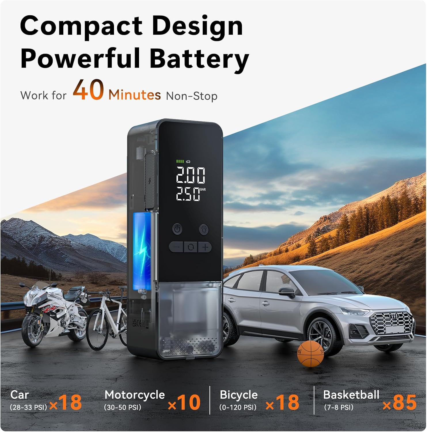 - 【2X Faster Inflation】 Equipped with a powerful motor, it provides with 30L/Min airflow. On a full charge, it takes only 52s to inflate a 195/ 65 R15 car tires from 30PSI to 36PSI. Whether you're in a hurry or dealing with a flat tire on the go, you’ll never have to waste time waiting again.
