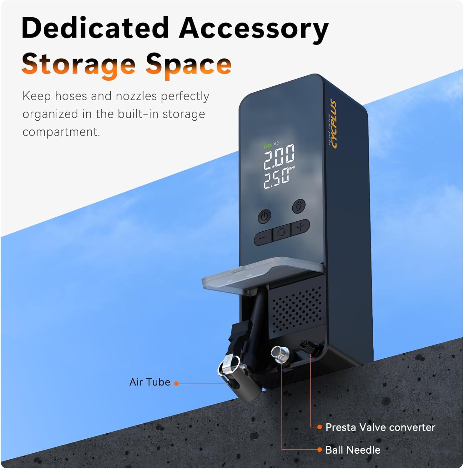- 【All Accessories to Hand】With the integrated accessory storage, you are prepared for any situation. The included valve adapters (ball needle, presta vavle) and air hose are simply screwed in