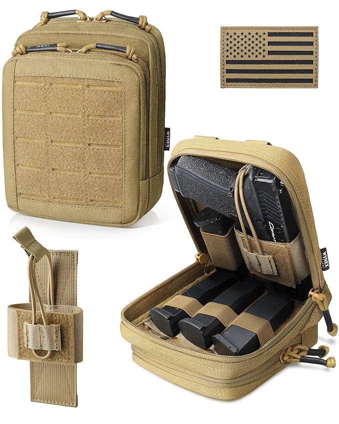 - FLEXIBLE MOUNTING: Utility Handgun Bag with two Molle back straps for easy attachment to a pouch or duty belt compatible with MOLLE/PALS system, keeping your EDC tools within arm’s reach. Plus, front laser-cut Molle platform of tactical pouch can be added to other accessories or a morale patch for enhanced customization and identification.