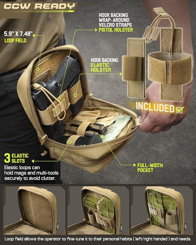 - CONCEALED CARRY A PISTOL: Molle Admin Pistol Pouch has a main compartment offers more organization options with its loop field and classic EDC layout that you can customize to fit entire loadout. On one side of loop field(5.9"x7.48"/15*19cm), it is equipped with removable pistol/elastic holster. On the other side, a wide pocket with three elastic loops in front of it for organizing items in sections to avoid clutter.
