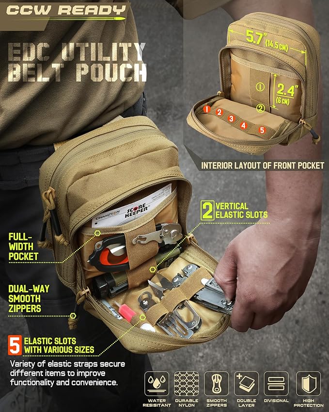 - QUICK DRAW WITH ONE-HANDED: Tactical EDC Belt Pouch closed by smooth double zippers, two pull tapes on the top allow for pulling down with single hand that access to the entire compartment quickly, making it easy to organize stuff and retrieve them as needed. Molle pouches are crafted with 1000D Nylon fabric which is excellent enduring, and water-repellent to keep all your gears shielded during work/adventure.