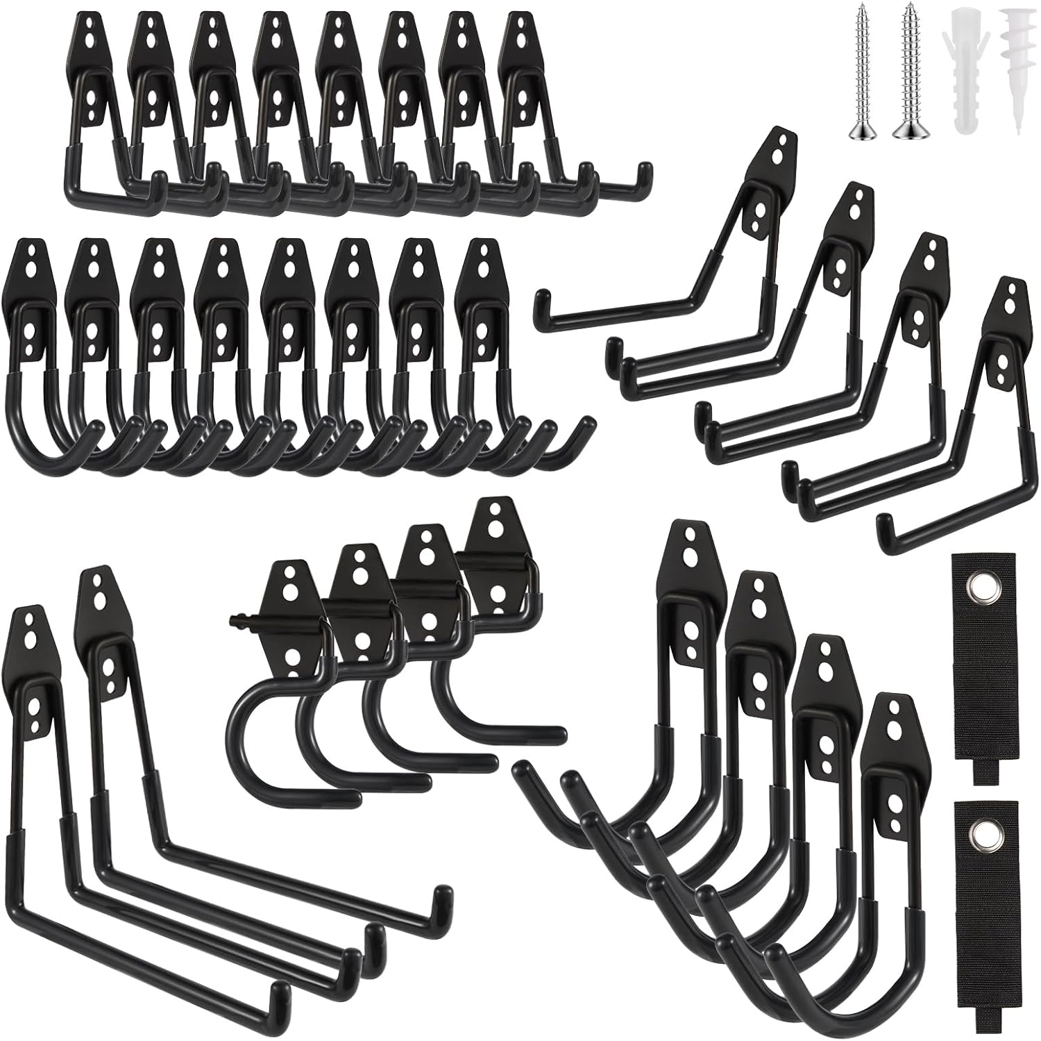 - ZexHok Wall Hook Assortment Set: 32 pack storage hooks organizer include with 6 sizes: 8pcs small J hooks, 8pcs small U hooks, 4pcs large J hooks, 4pcs middle U hooks, 2pcs large U hooks, 4pcs S hooks and 2pcs straps for hanging tools of different sizes and weight.